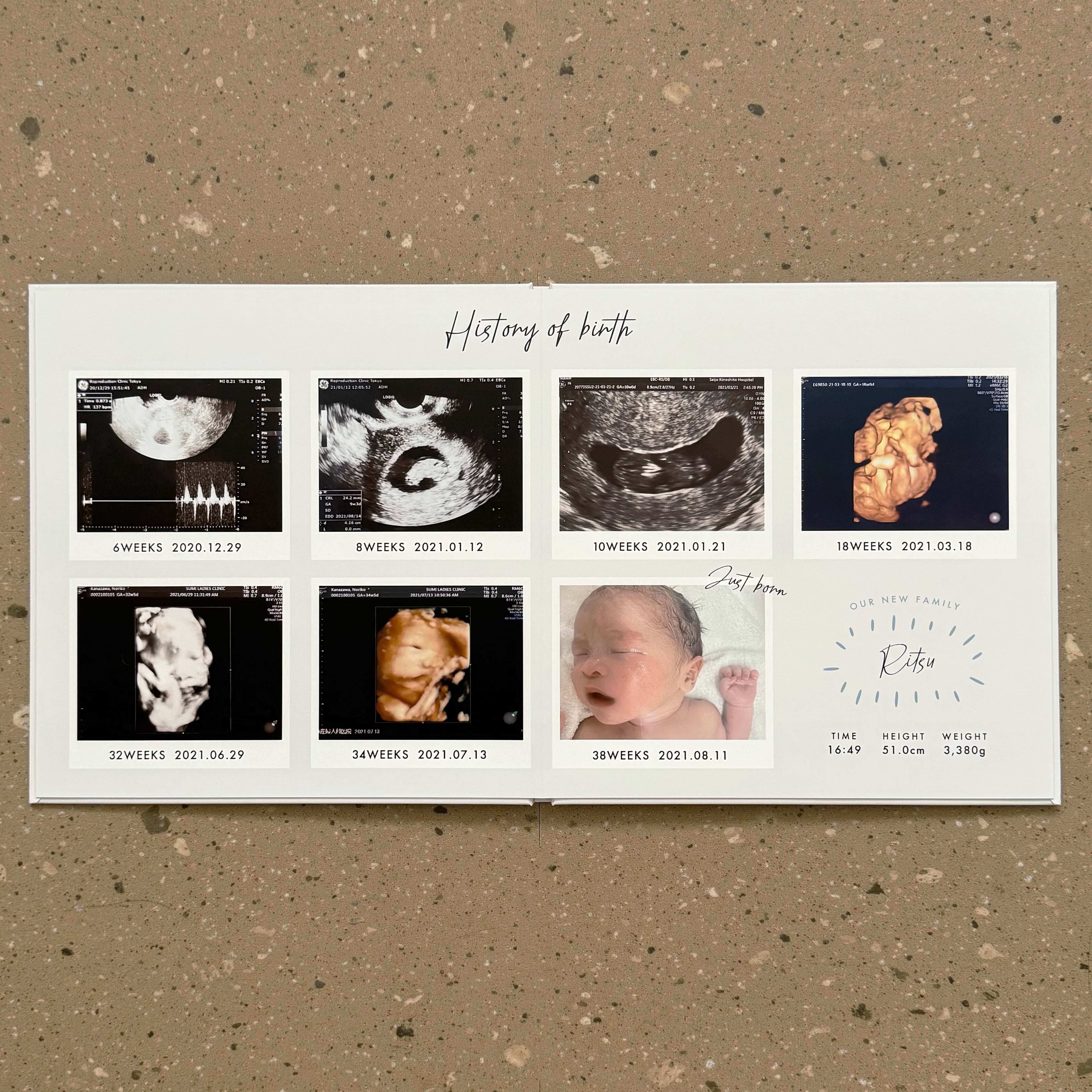 ・誕生時の写真1枚(それぞれに撮影日付が入ります。日付ではなく週数を記載されたい場合は、週数表記変更をご選択ください(¥900))