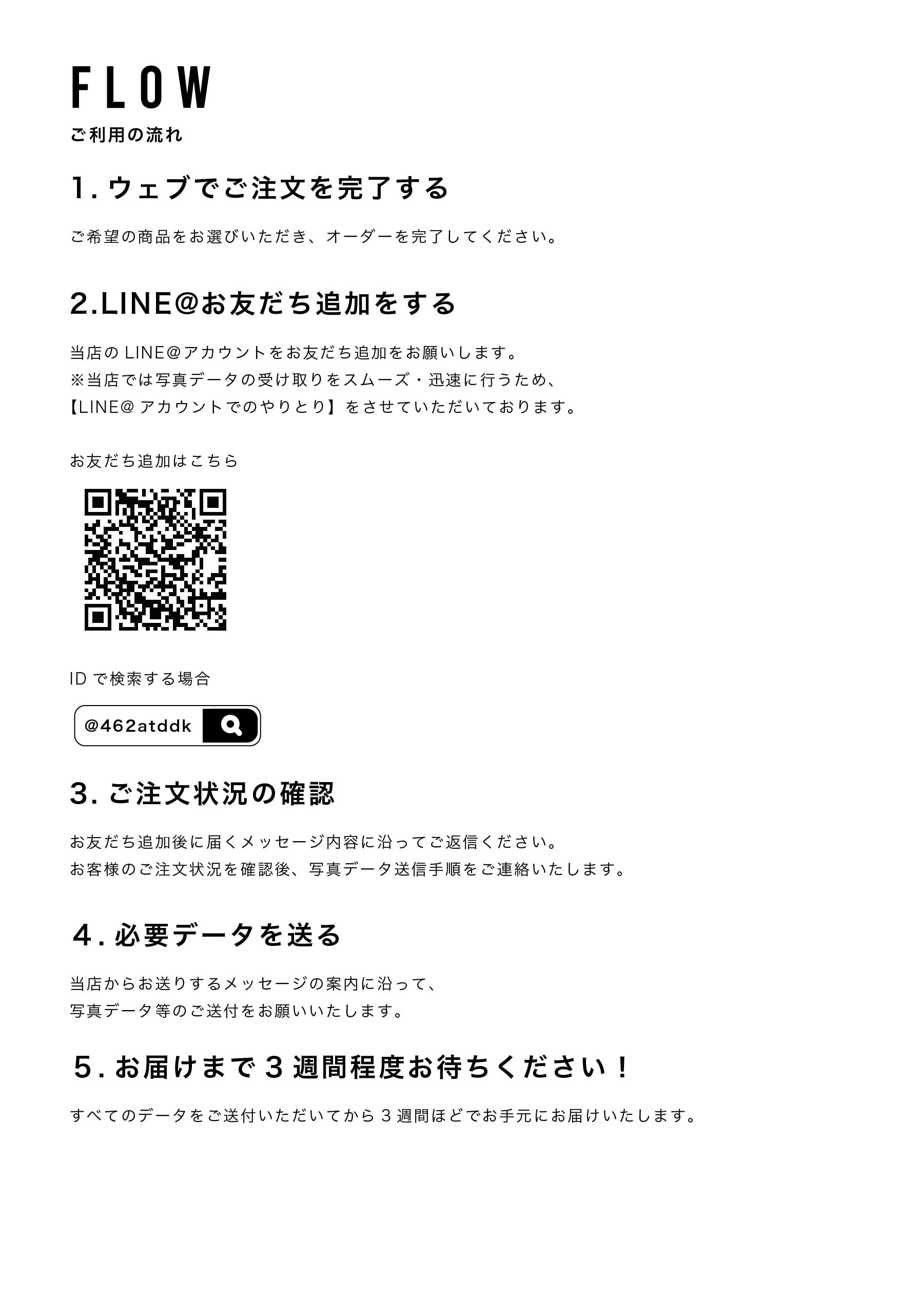 お写真は、当店のLINEアカウントにて受け取りをさせていただきます。ご注文完了後、LINEお友だち追加をお願いします。