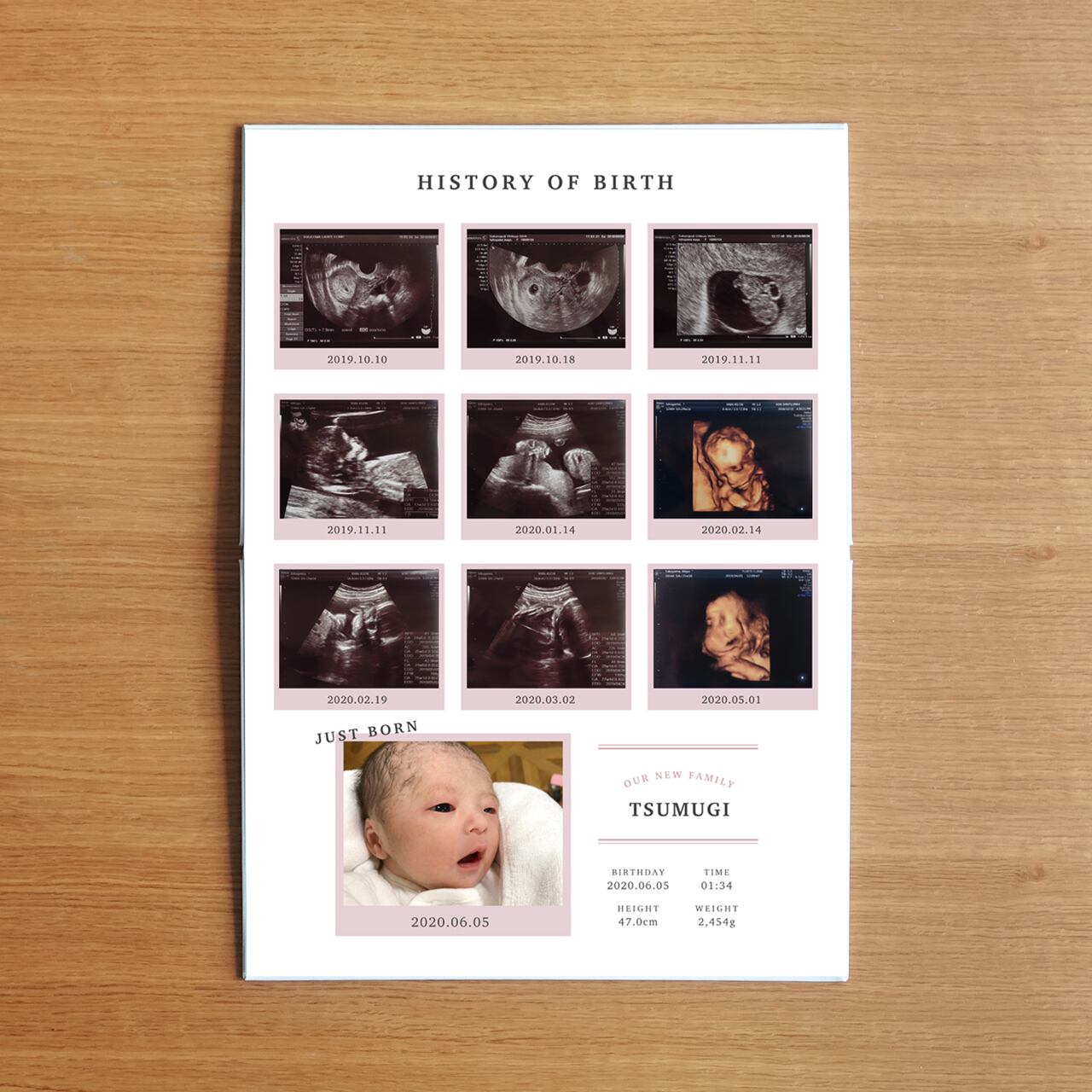 ・誕生時の写真1枚(それぞれに撮影日付が入ります。日付ではなく週数を記載されたい場合は、週数表記変更をご選択ください(¥900))